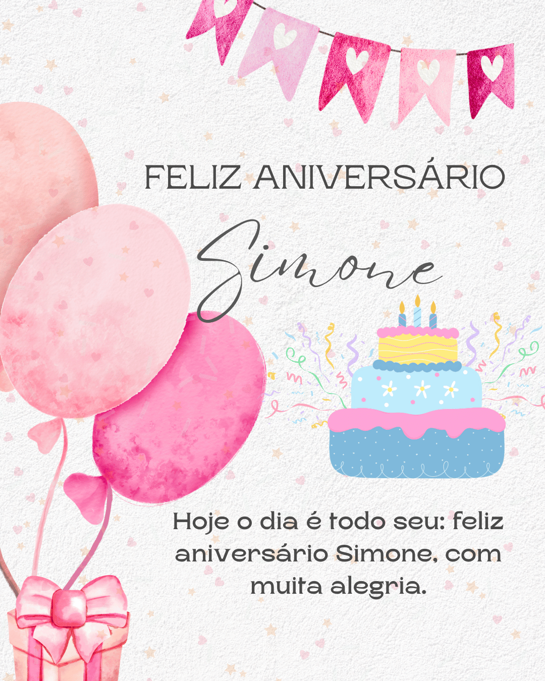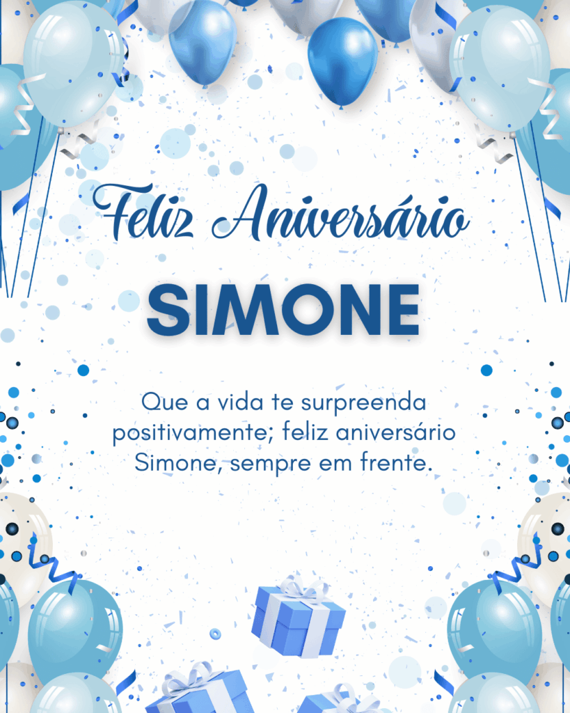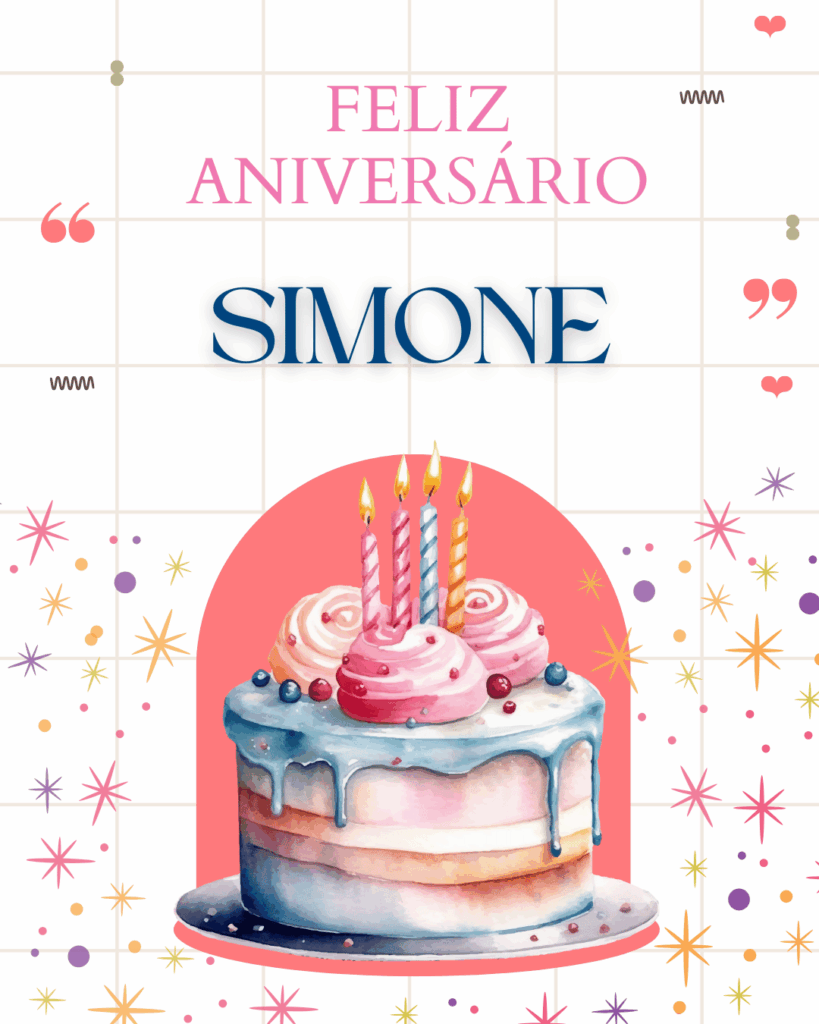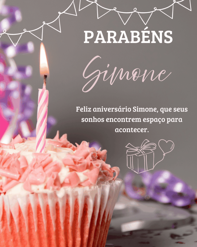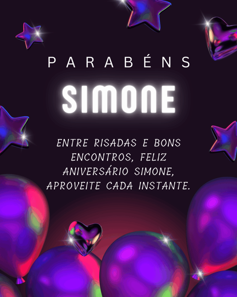 Simone, hoje é o seu dia e eu quero te desejar um aniversário cheio de paz e alegria. Você tem um jeito especial de deixar tudo mais leve, com sua presença e seu carinho. Feliz aniversário Simone, que seu coração esteja tranquilo e que você receba amor em cada detalhe.