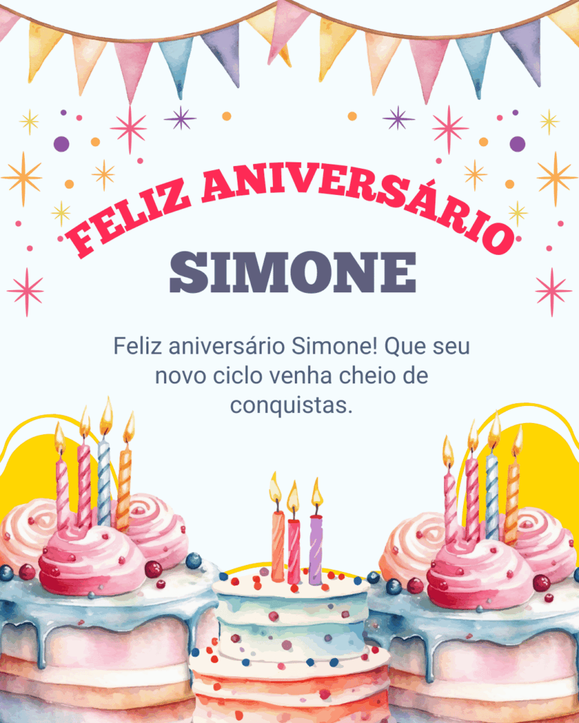 Feliz aniversário Simone! Que hoje você se sinta abraçada por mensagens sinceras, por carinho verdadeiro e por aquela energia boa que faz o dia ficar mais bonito. Você é uma pessoa forte, sensível e cheia de luz, e isso inspira quem está ao seu lado.