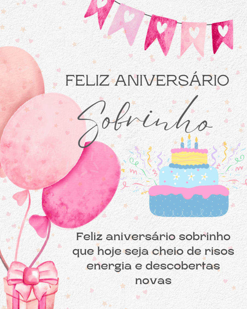 Feliz aniversário, sobrinho! Que hoje seja um dia especial, com sorrisos, presentes e muita diversão. Você merece viver um aniversário lindo, cercado de amor e de pessoas que te querem bem.
